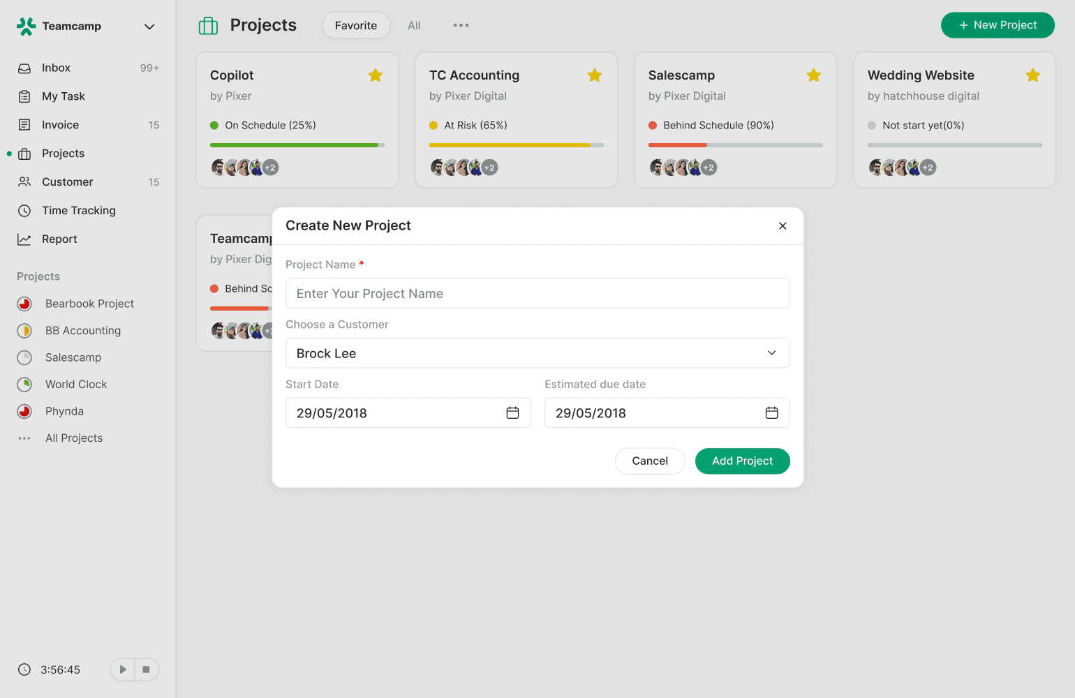 The "New Project" button is on the top-right corner of the screen. Name your project and select the customer for whom this project is being executed. Specify the project's starting date and an estimated due date for your project. Click on the "Create Project" button, and the project is created. Check out this article for information about projects.
